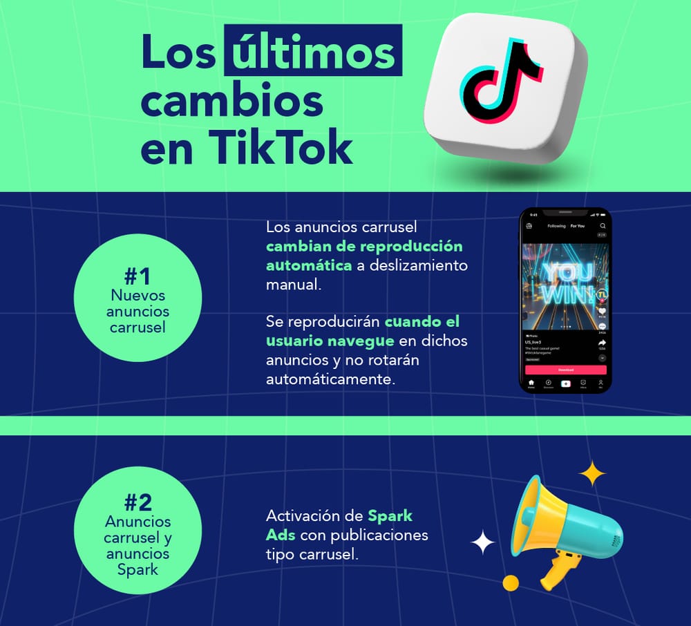 TikTok está cambiando los anuncios carrusel de reproducción automática a deslizamiento manual. Ahora es el usuario el que tendrá que realizar la acción y ya no rotarán de manera automática, de esta manera se promueve mayor interacción con la plataforma.